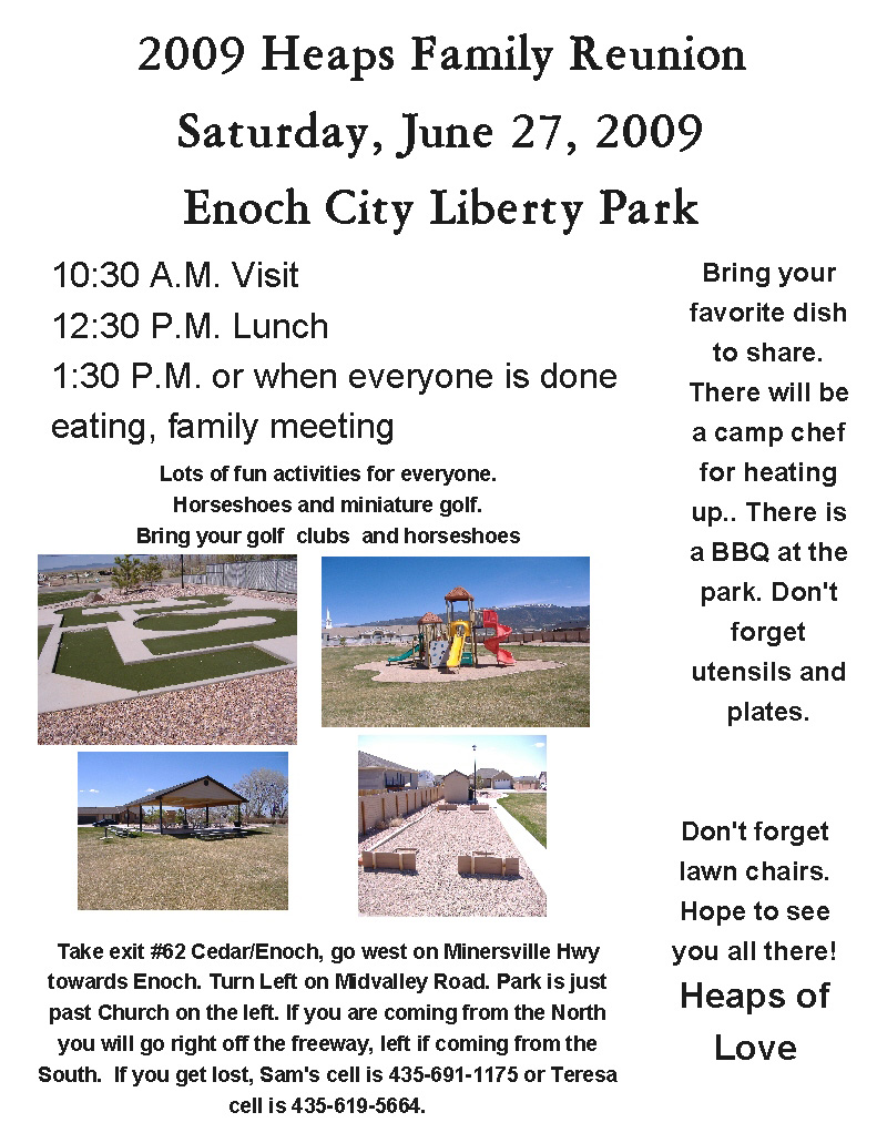 [Benjamin F. Heaps] [Benjamin F. & Ann Eva] [Ben's Family Photos] [Ann's Family Photos] [First Generation] [More Photos] [Ancestry List] [Immigration & Migration] [Past Reunions] [2009 Heaps Reunion] [2008 Heaps Reunion] [2007 Newsletter] [2007 Reunion Photos] [2006 Newsletter] [2006 Reunion Photos] [2005 Reunion] [2004 Reunion] [2001 Reunion] [2000 Reunion] [1999 Reunion] [1998 Reunion] [1997 Reunion] [1996 Reunion] [1995 Reunion] [1994 Reunion] [1993 Reunion] [1991 Reunion] [1990 Reunion] [1989 Reunion] [1988 Reunion] [1986 Reunion] [1985 Reunion] [Restored Photos] [Family Recipes] [Messages & News]